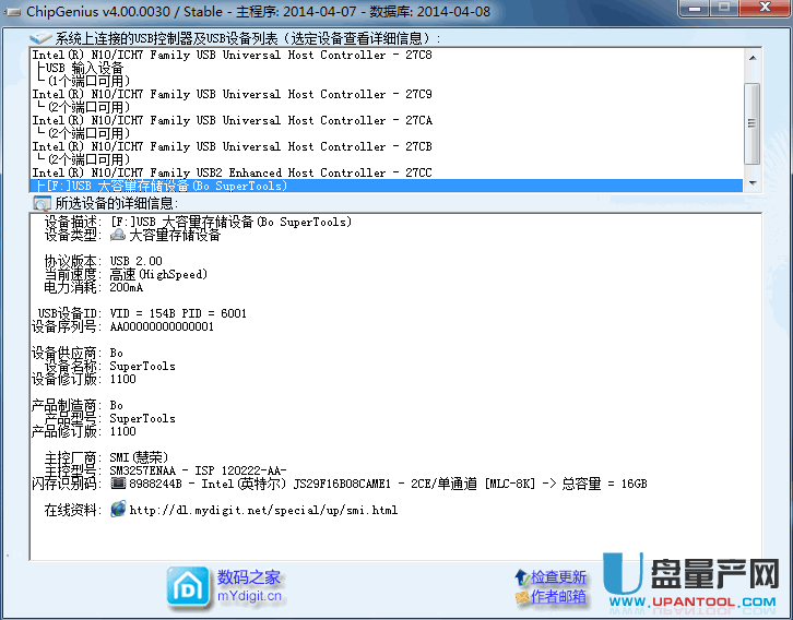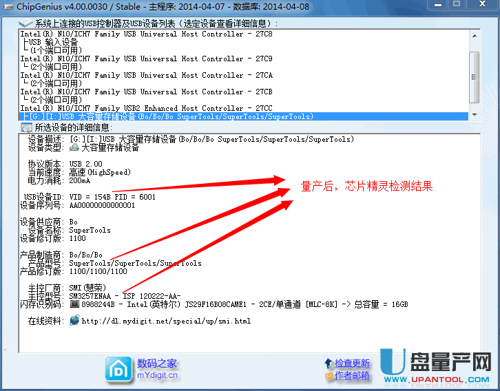 量产以后芯片精灵检测结果如图,可以看到量产可以改变你的型号U盘名字。