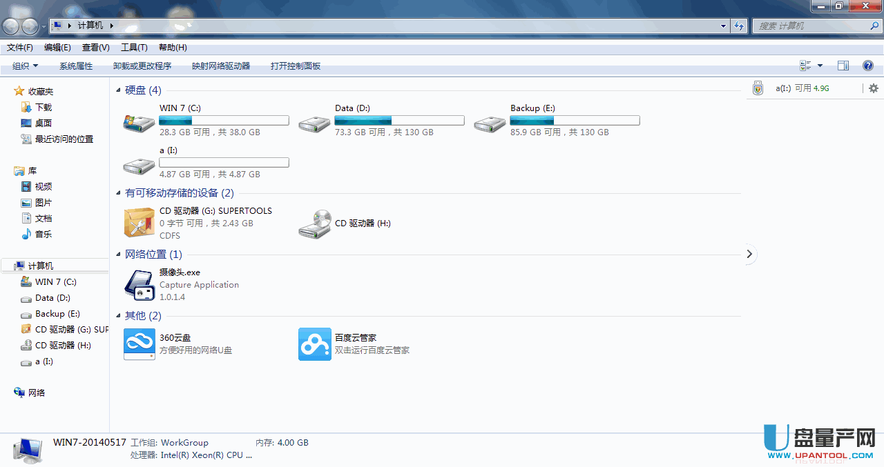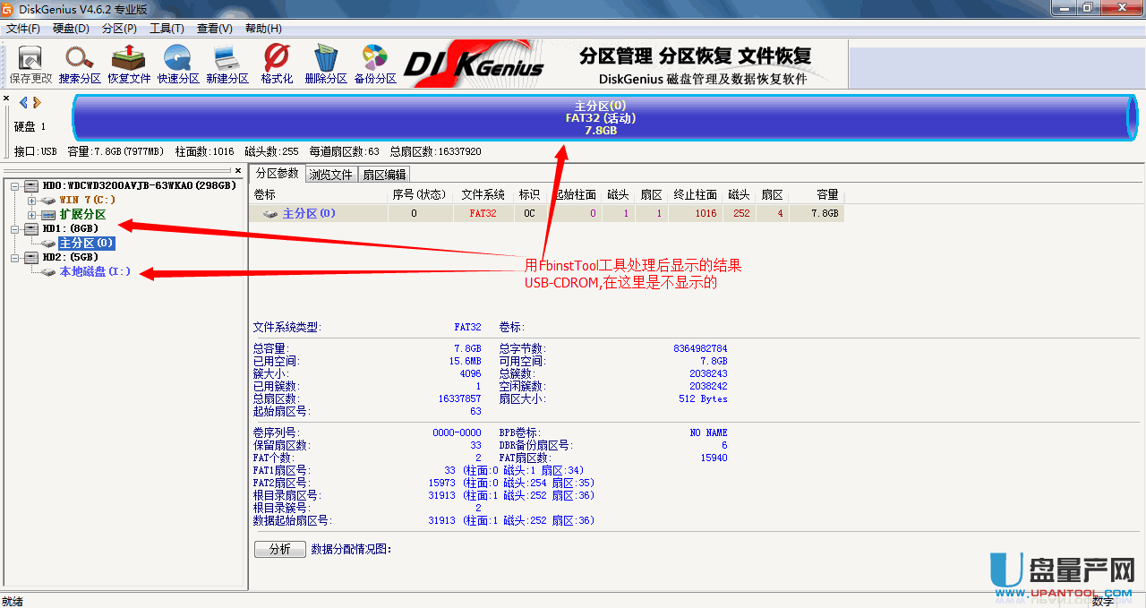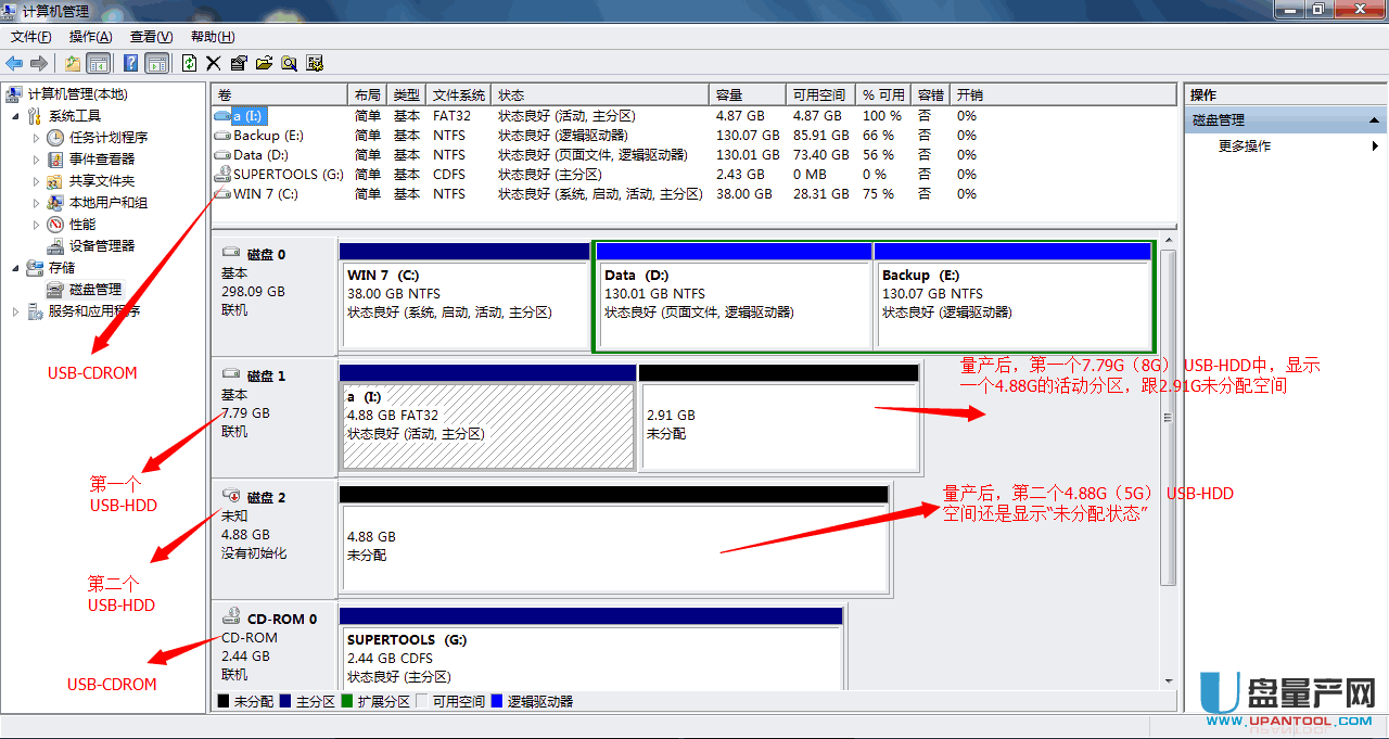 量产后的我的电脑里看到的U盘分区,可见的只有2个,一个cdrom一个hdd分区,另一个分区是暂时隐藏的。