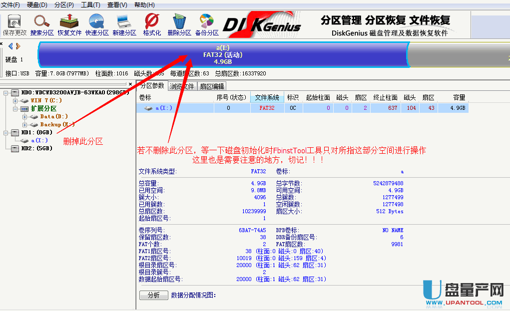 注意使用DiskGenius分区工具把HDD里的可见分区删除掉,如上图所示,不然就会少一部分分区不被使用。