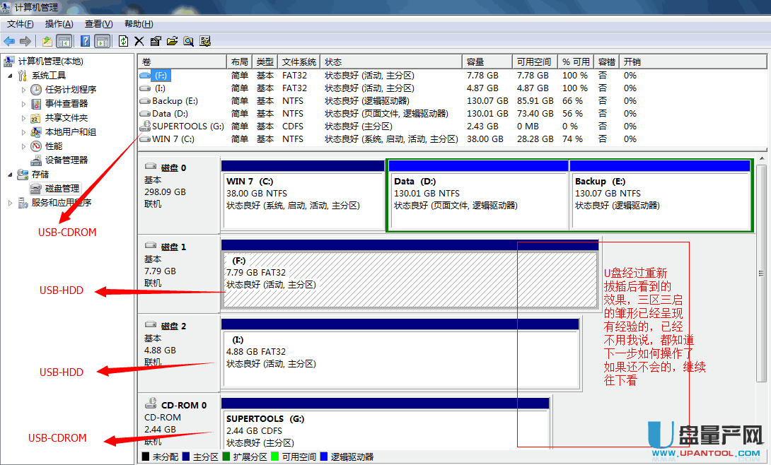如图可以在我的电脑右键 磁盘管理里看到U盘已经被分成了3个分区了。